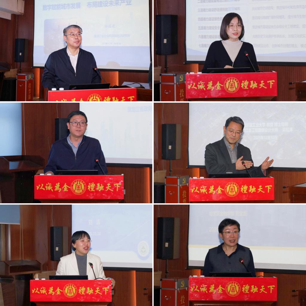 主旨发言环节,六位专家围绕数字赋能的多维实践分享了精彩见解。黑龙江省社会科学院经济研究所所长孙浩进以“数字赋能城市发展·布局建设未来产业”为题,分析了数字技术在智慧城市建设中的应用现状,并解读了黑龙江省不同城市发展数字经济的差异化布局。黑龙江省寒地建筑科学研究院城市更新研究所副所长王健聚焦“数字技术赋能城市更新”,阐述了数字化手段在城市体检与更新中的具体应用,并结合牡丹江市牡纺片区更新策划实例进行说明。黑龙江省大数据政务中心副主任孟广仕就“数字政府建设赋能龙江营商环境优化”展开论述,围绕《优化营商环境条例》,介绍了以数据驱动政务服务流程重塑、提升治理效能与营商便利度的龙江实践。哈尔滨工业大学建筑与设计学院博士生导师、教授吴松涛从新质生产力视角出发,分享“校区·园区·城区:城市创新生态圈融合模式测度及协同策略研究”,强调人在创新生态系统中的核心地位,提出应将以人民为中心的发展思想融入创新生态圈建设。东北林业大学博士生导师、教授刘洁以“时空大数据赋能城市风险治理”为主题,展示大数据在保障城市人员安全、土地安全及寒地交通基础设施安全三方面的创新应用与潜力。哈尔滨金融学院省级一流专业建设点信用管理专业带头人、教授刘金波围绕“龙江社会信用体系与数字政府深度融合的路径探究”,阐述二者融合如何通过优化营商环境、信用融资助力小微等方式推动经济高质量发展。